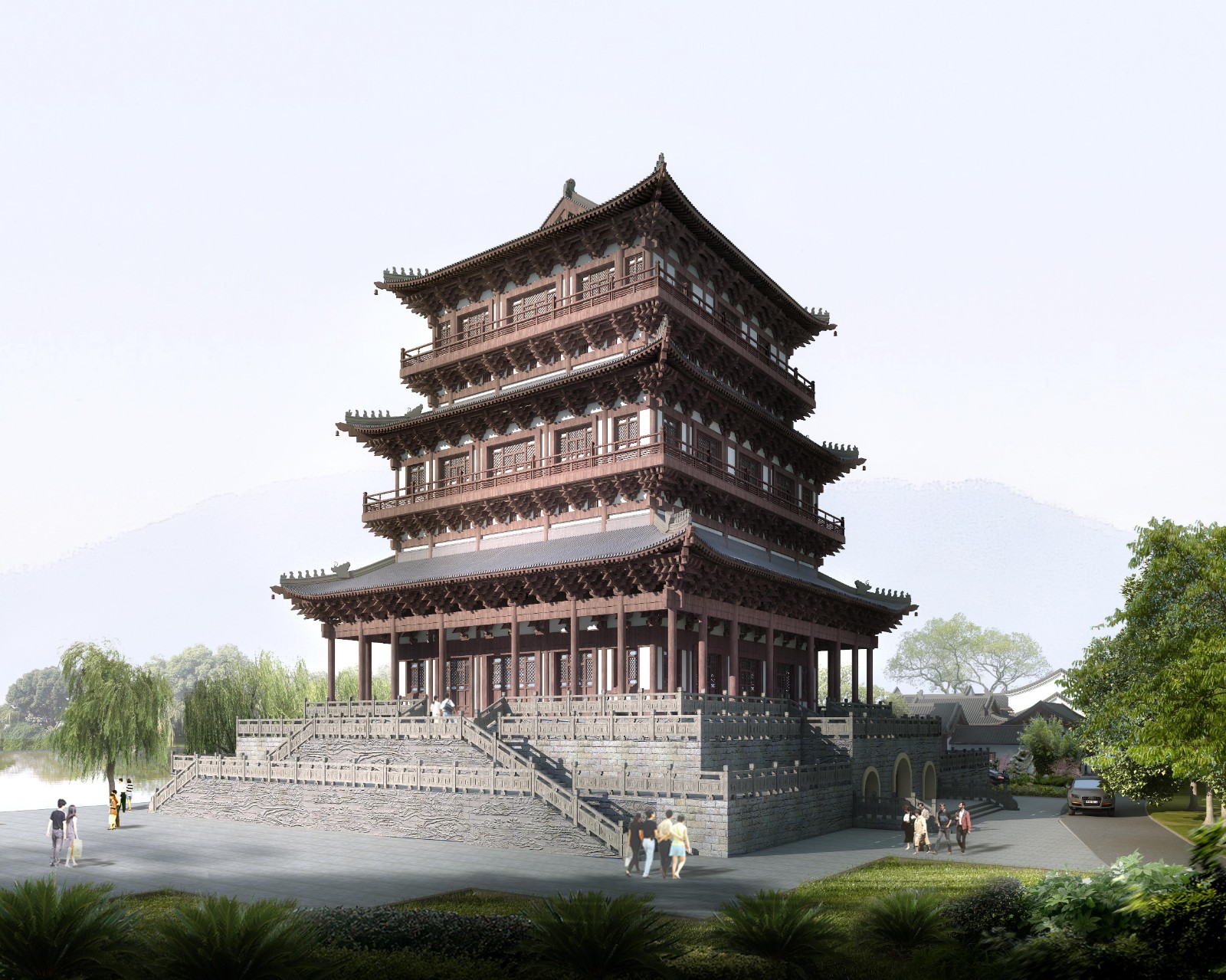 项目概况:项目总占地面积约18000㎡。本地块总平面规划布局,与秦时期的灵渠历史文化景观遥相呼应,在湘江东岸区域延续历时性的时空格局,沿轴线由北向南纵深规划设计明代早中期的魁星楼及文化景观广场,明代中后期的白云驿站,清代初期的白云驿馆,以及清代风格的白云阁及临江楼。规划设计拟复原明代风格的魁星楼,以及明清风格的白云驿、白云阁、临江楼,将兴安的人文历史景观建筑从秦始皇时代一直往后世推演,再现兴安历史较为完整的纵向维度。